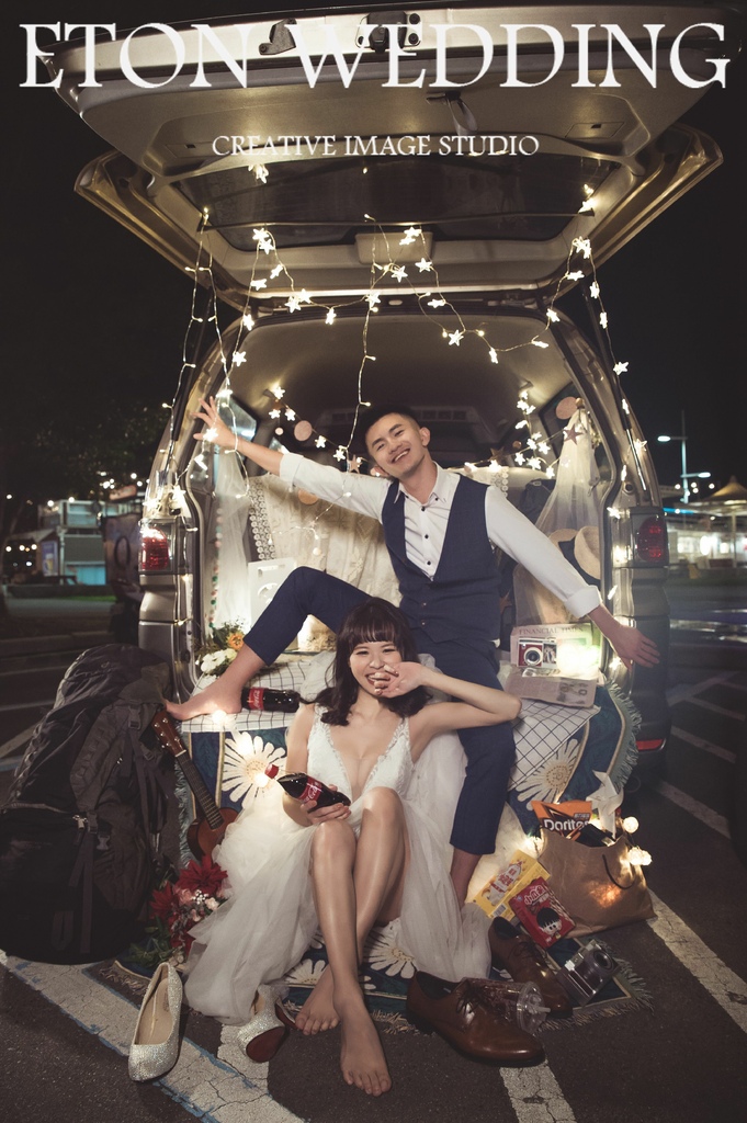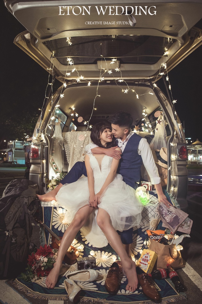 沒想到夜晚的大稻埕碼頭也可以如此浪漫吧~想要來點創意的婚紗照嗎?像這樣的風格小編超推薦!善用車子的后車廂,搭配燈泡、地毯、小零食及對於兩人充滿意義的物品,打造一組與衆不同的婚紗照風格!攝影師善用車子燈光的技巧,讓夜景婚紗效果更佳!這套婚紗的深V的剪裁,讓女孩展露出好身材之外,禮服的下身的輕婚紗設計讓女孩整體看起來更加修飾喔!