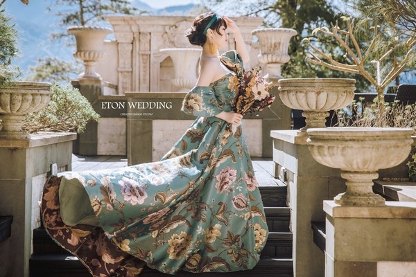 像是新人選擇的這一件印花款式的禮服就特別適合~不會太過鮮艷,卻又能拍出經典風格的婚紗照,關鍵就在選擇禮服的色系!建議新人可以選擇較爲柔和色系的禮服,讓整體婚紗照拍出來的效果更佳!若是想要讓婚紗照,更加有特色的話,建議新人可以在造型上加上髮帶!